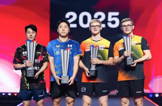 拉斯维加斯7月12日电(记者黄恒)正在12日举行的世界乒乓球职业大联盟(WTT)美国大满贯赛男双决赛中, 韩国组合林仲勋/安宰贤取法国的勒布伦兄弟正在颁仪式上。。