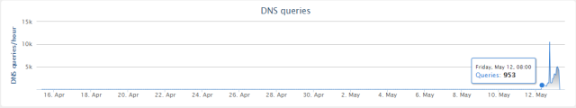 WannaCry样本中域名,正在今天全球范畴起头后拜候量霎时激增,此前却没有任何被访迹象。(图片来自MalwareTech小我博客)。