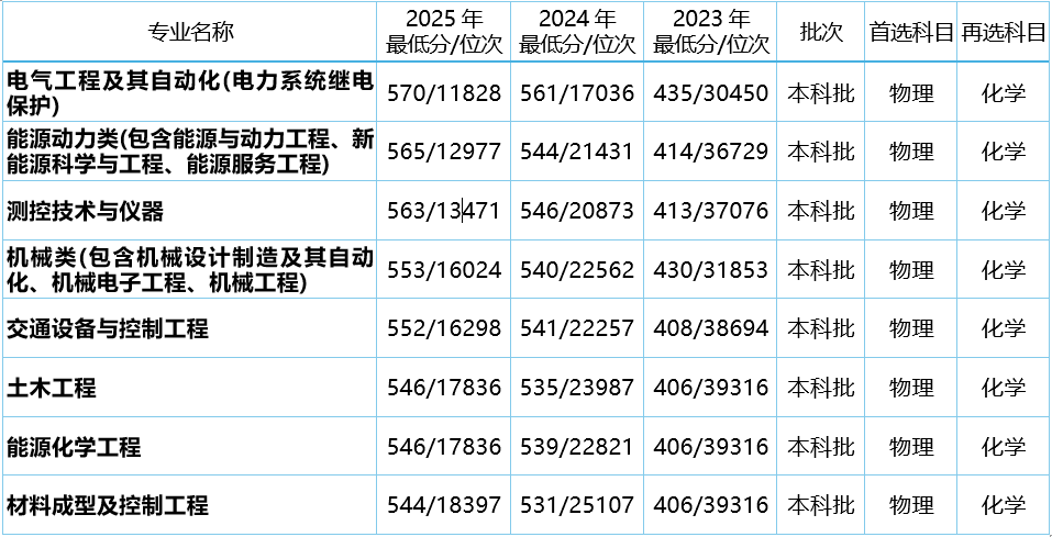 分数定位:物理类考生合作集中正在工科专业,电气工程及其从动化需570分(位次11828),测控手艺取仪器需563分(位次约13471),机械类需553分(位次16024),土木匠程、材料成型及节制工程等专业需544-546分(位次约18397-17836);汗青类考生仅有市场营销、物流办理两个专业招生,需479-486分(位次10774-9809)。取2024年比拟,2025年物理类劣势专业登科分数略有上升(2024年电气工程及其从动化最低分562分),次要受博士点获批影响,考生需合理评估本身合作力。